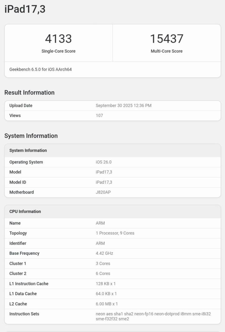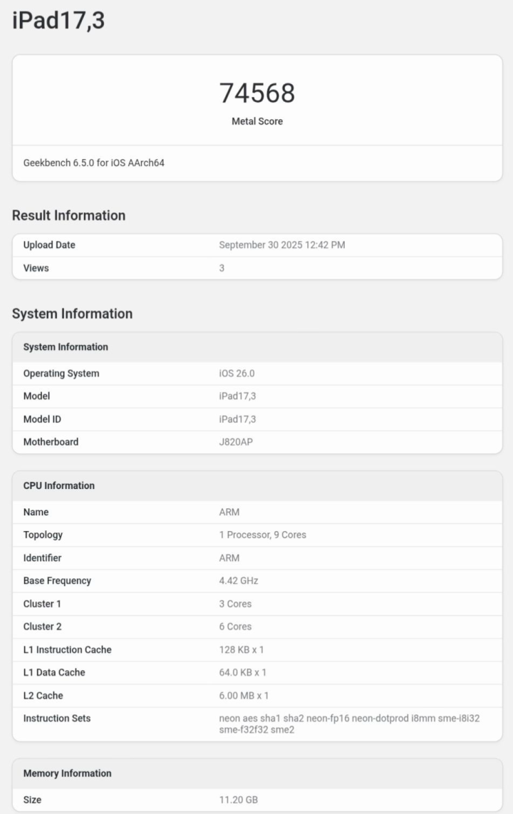 此次在Geekbench 6数据库中曝光的iPad Pro(型号iPad17,3)搭载了苹果新一代的M5芯片,其核心配置与性能表现再次成为焦点。M5芯片采用了3个性能核心与6个能效核心的“3+6”九核心架构设计,性能核心的基准频率高达4.42GHz,相较于前代M系列芯片,其单核与多核处理能力均实现了显著跃升。